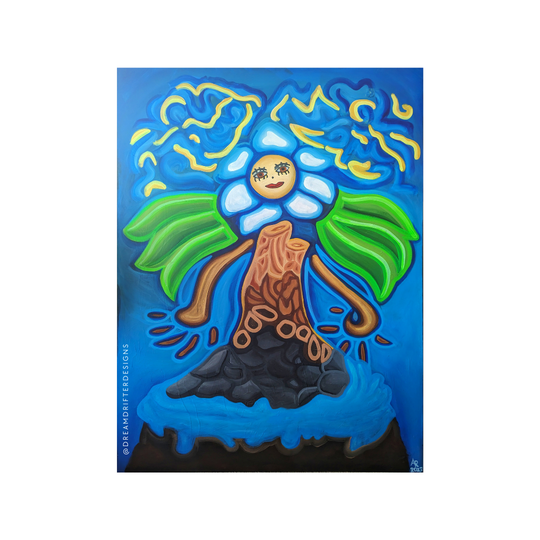 Miss Moonflower was completed in acrylic paint at the end of 2023, and lives on a 3x4 foot canvas. Wired and ready to hang in your home, studio, or community space.