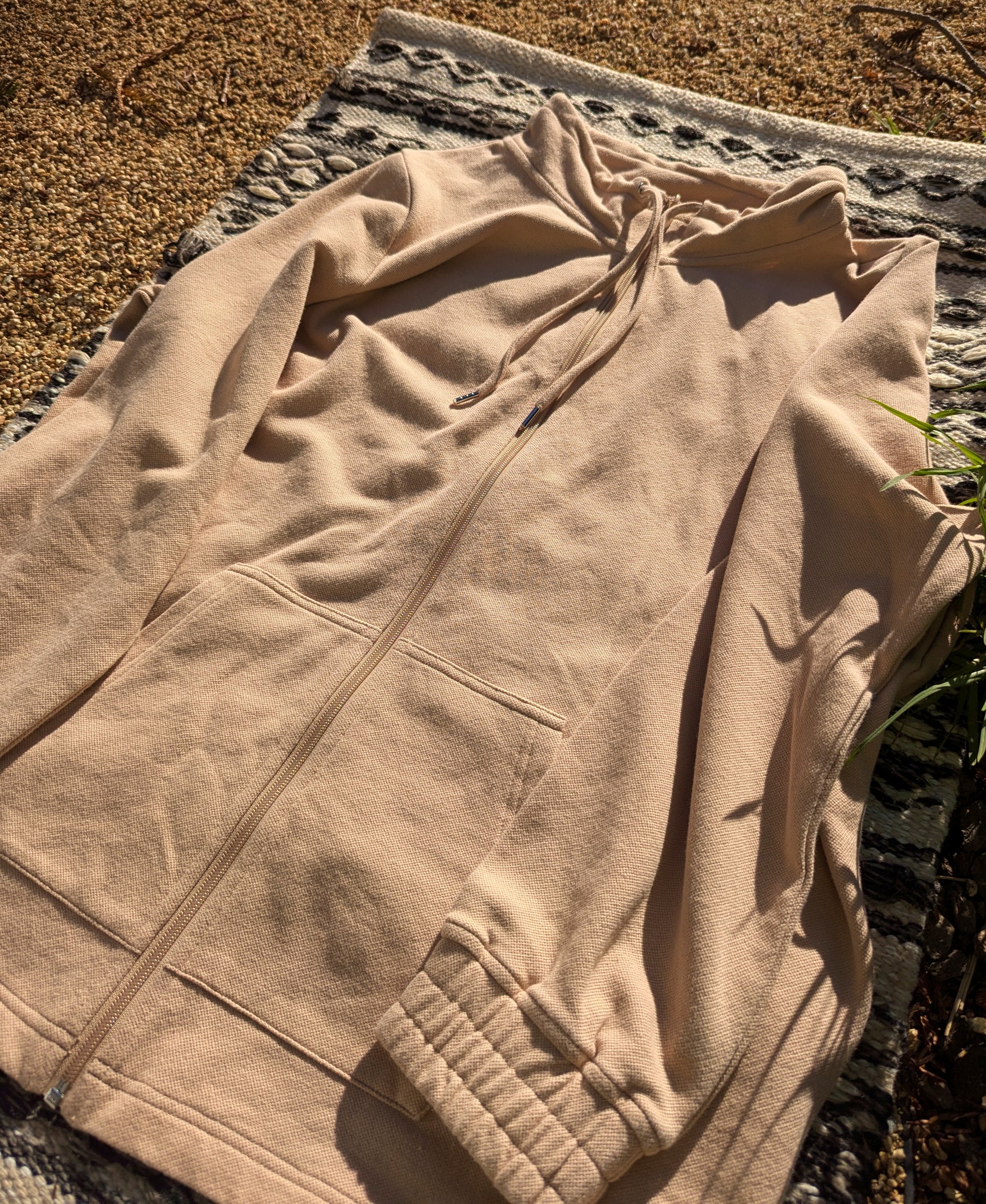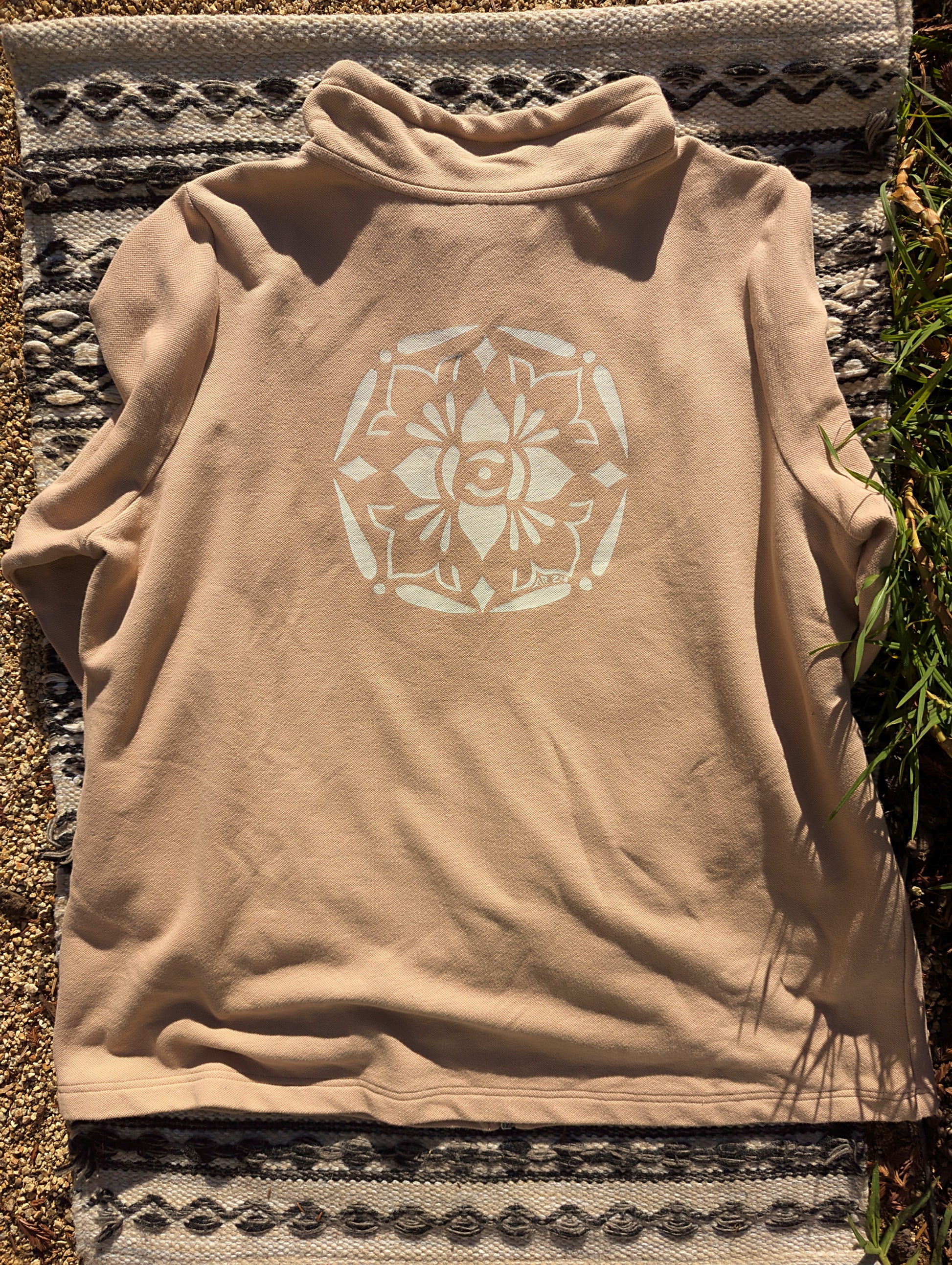 A special, one of a kind jacket with my design - The Center, 2024 - printed on it. The 92% cotton, 6% polyester, 2% spandex, feminine size 1X jacket comes in a beautifully textured light tan color.