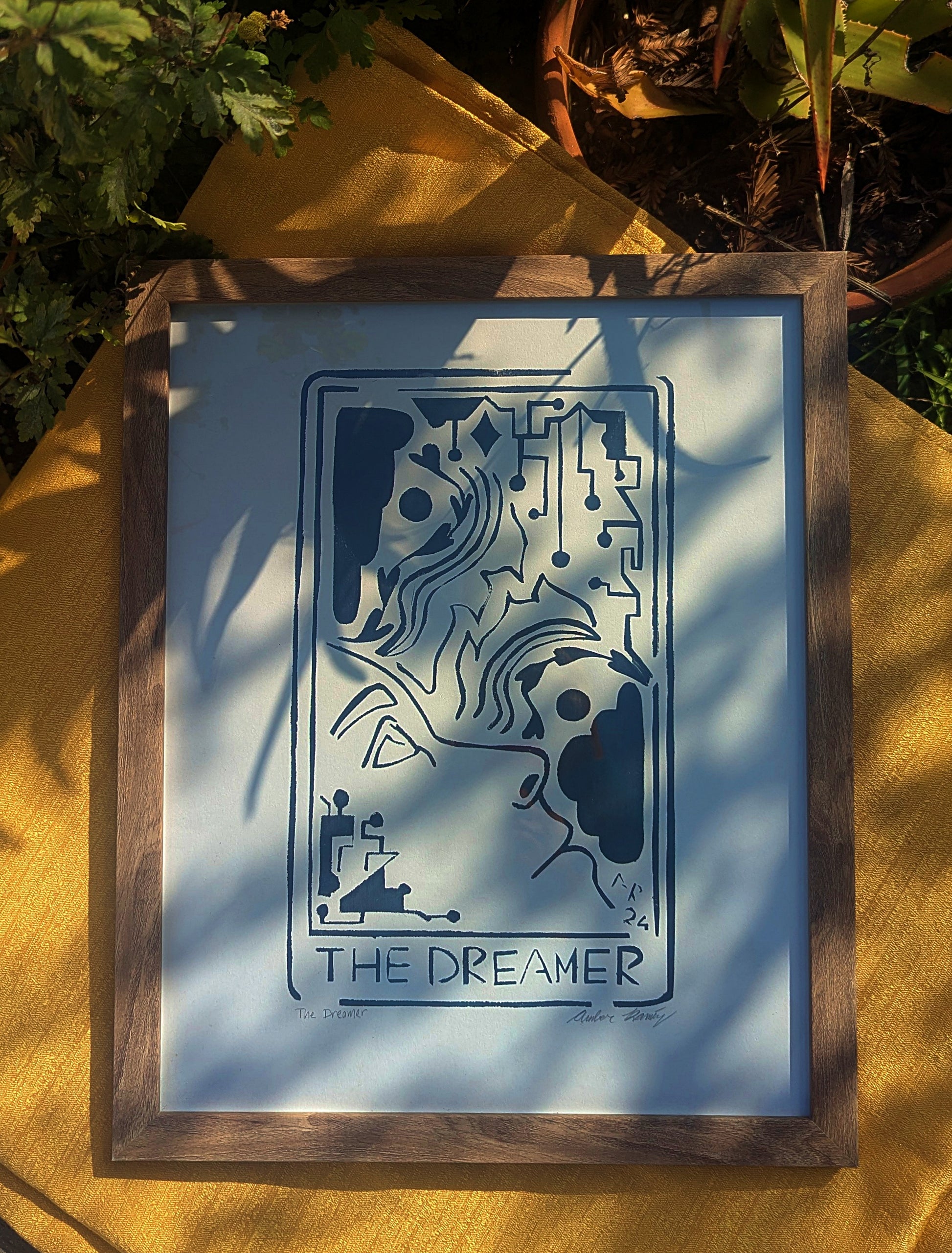 A 1/1 stencil-screenprint of powerhouse design - The Dreamer, printed in 2025 and design originally created in Spring of 2024.